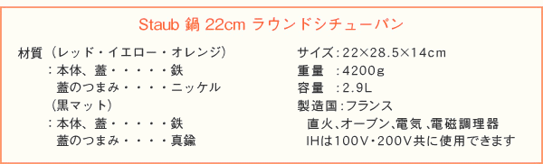 プロからご家庭までお使い頂ける三ツ星シェフも大絶賛のStaub社製高機能鍋 『オーバルシチューパン 23cm』 です。■独自のエマイユ加工!:鋳鉄の下地の表面と内側にエナメル質ホーロー加工が3層に渡って施されています。そのため、お手入れが簡単な上、食物の酸にも負けません。■セルフ・ベイスティング・システム:温められた鍋の中の肉や野菜から染み出す水分が熱せられ、蒸発し、蓋の内側の突起を通り、水滴となり食材に降り注ぎます。このサイクルがあるため、最低限の水分でジューシーでおいしく調理が可能です。■プレゼントにも最適!:新生活、結婚祝い、母の日などのプレゼントにもオススメ♪※お買い求めの際は、サイズ(オーバルシチューパン:23cm/ラウンドシチューパン:22cm)及びカラー(レッド・イエロー・オレンジ・黒マット)をお確かめ下さい。○製品仕様/[サイズ]18×28×14cm/[重量]3500g/[容量]2.2L/[材質](レッド・イエロー・オレンジ)本体・蓋:鉄、蓋のつまみ:ニッケル/(黒マット)本体・蓋:鉄、蓋のつまみ:真鍮/[対応機器]直火、オーブン、電気、電磁調理器(※IHは、100V・200V共にご使用いただけます)